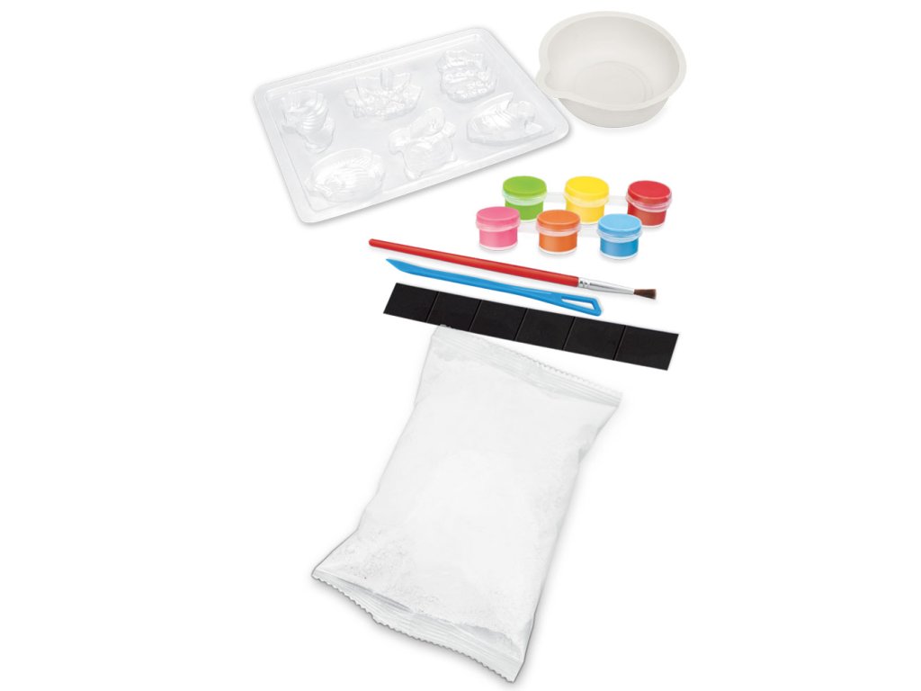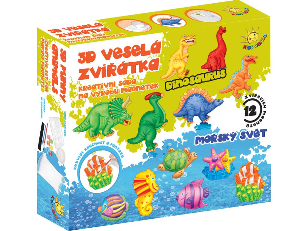 Kreativní sada na výrobu magnetek rozvíjí ruční dovednosti a fantazii. Děti si vyrobí sádrový odlitek, do kterého vtisknou magnetek a vymalují si ho podle fantazie nebo předlohy, magnetky pak ozdobí Vaši lednici. Motiv pro vyrobení magnettek jsou zvířátka - dinousaři a mořský svět.