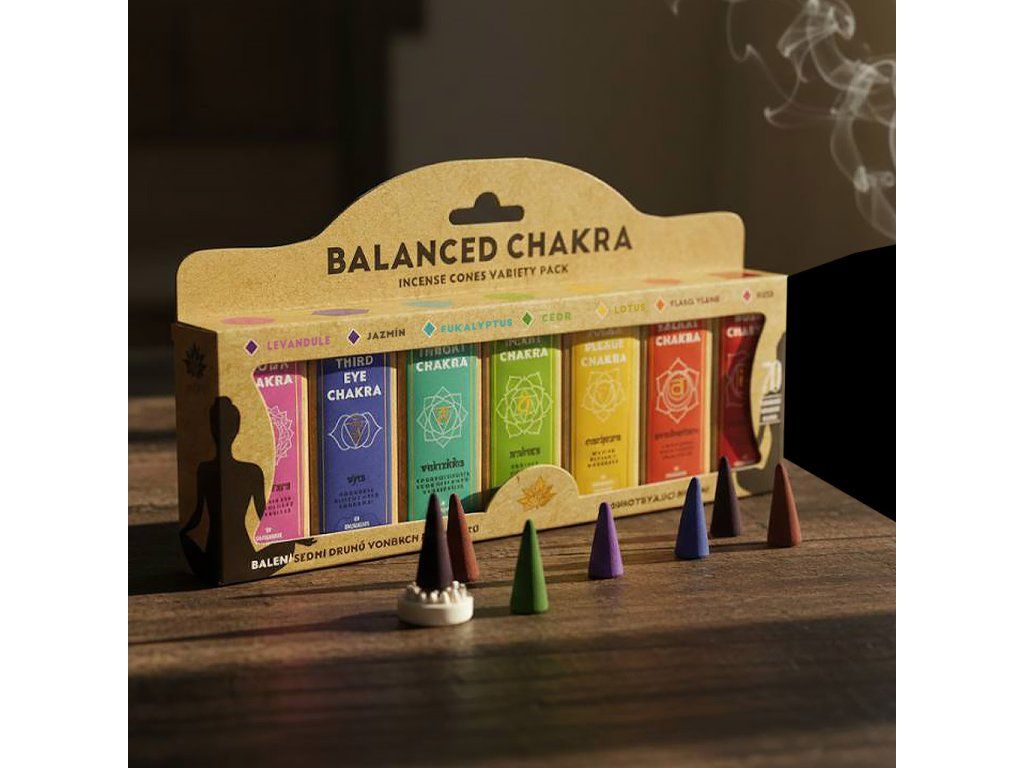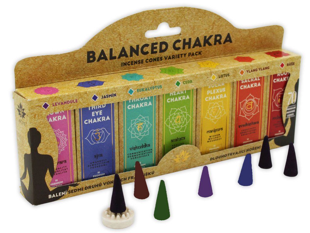 Barevná dárková krabička obsahuje 7 druhů františků po 10 kusech. Každý druh má svou barvu a vůni a je určen na podporu jedné určité čakry v našem těle.
