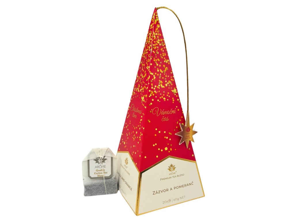 20 čajových sáčků s výborným černým čajem ze Srí Lanky ochuceným zázvorem a pomerančem zabaleno v krásné designové pyramidě s vánočním motivem.