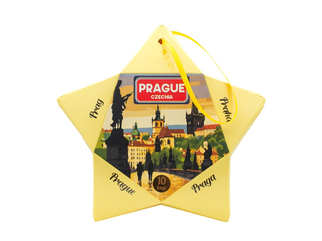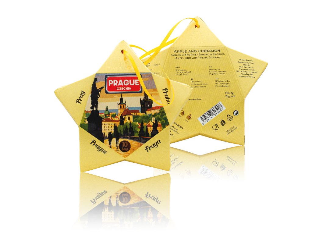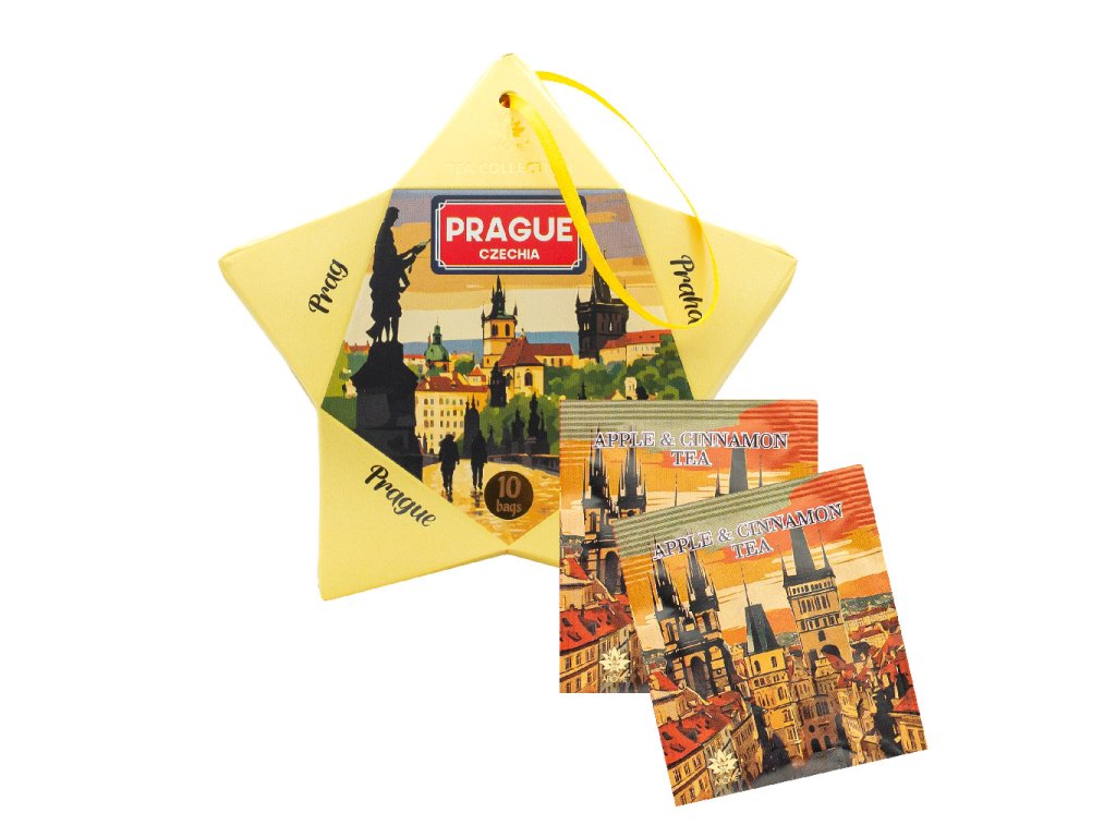 10 kusů sáčků černého čaje ze Srí Lanky s příchutí jablka a skořice je baleno v dárkové krabičce ve tvaru hvězdy zdobené krásnými obrázky historické Prahy.
