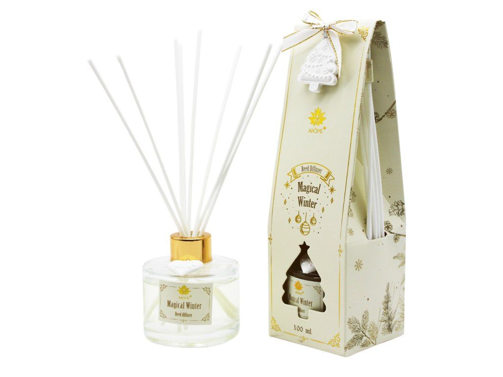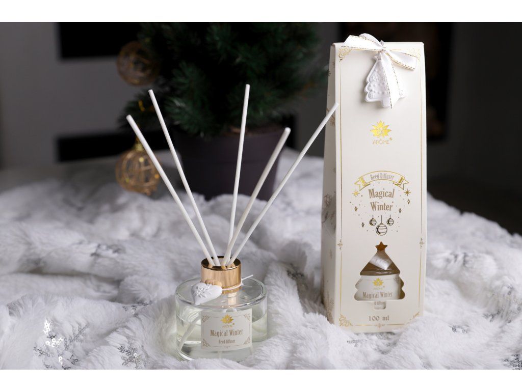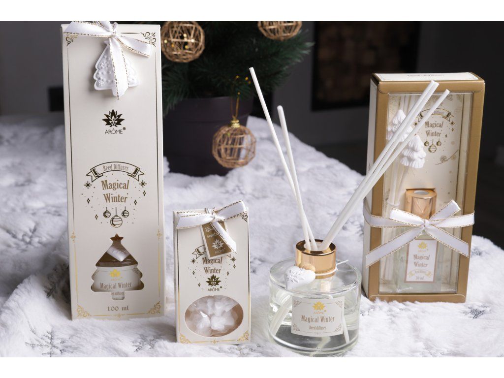 Bílé a zlaté elegantní balení ARÔME difuzéru s osmi tyčinkami a s dvěma ozdobnými vonnými jíly na lahvičce a obalu připomíná zimu. Difuzér nese i název Magická zima. Obsah 100 ml.