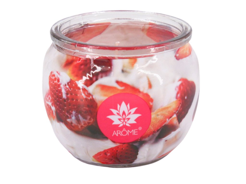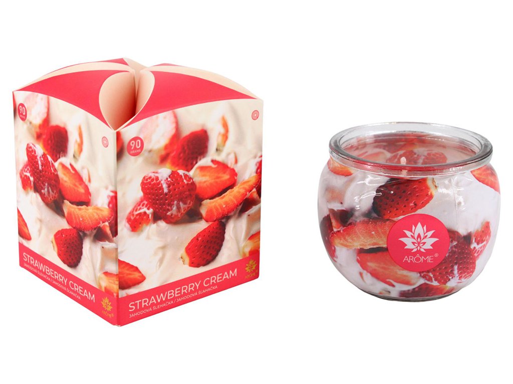 Dekorativní vonná svíčka ve skle s vůní jahod se šlehačkou může hořet všude - při večeři, v koupelně nebo na verandě. Osvěží vzduch a přinese pohodu. Proto vonné svíčky tak často používáme. Vonná svíčka je zároveň hezkou dekorací v interiéru.