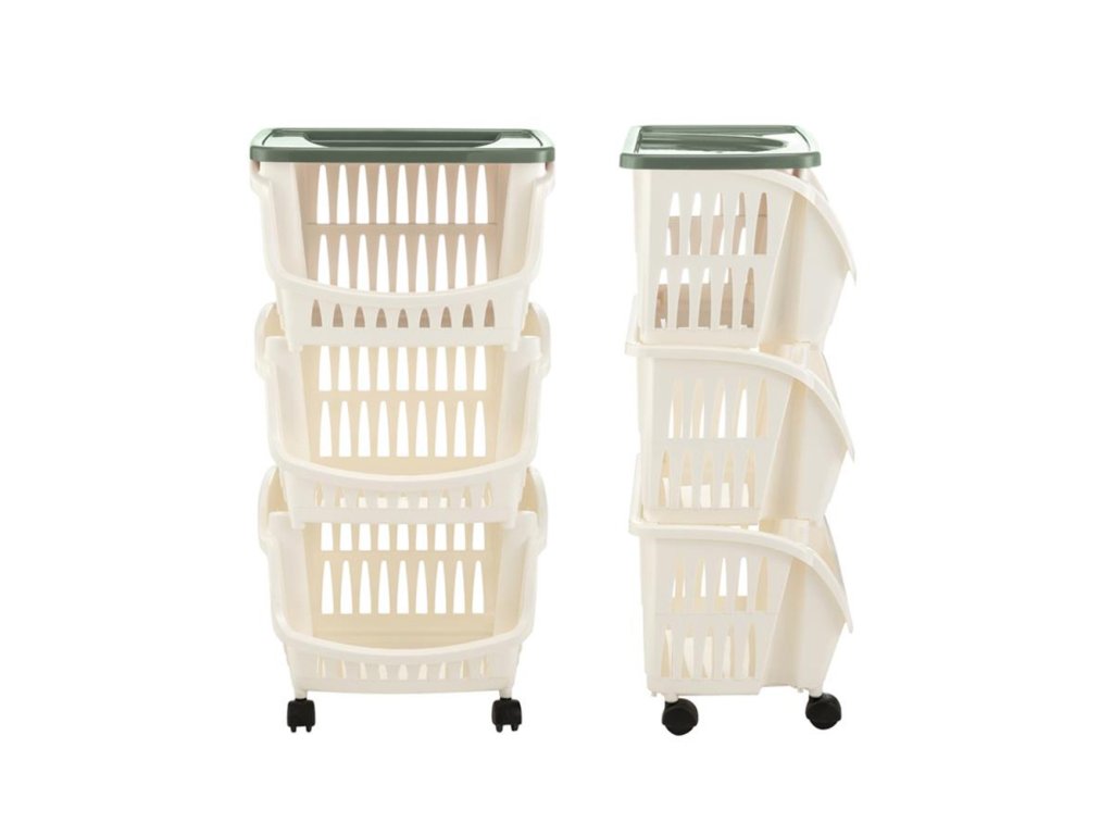 Pojízdný regál se skládá ze 3 košíků a 1 podnosu, košíky jsou do sebe zacvaknuty pomocí zámků. Tři přihrádky mohou sloužit jako přehledný a snadno dostupný úložný prostor. Nebo si do nich nachystáte všechny potřebné věci, suroviny k vaření, ovoce, drobné pohoštění a regál můžete snadno přemístit, kam zrovna potřebujete. Je vybaven plastovými otočnými kolečky pro snadnou manipulaci.