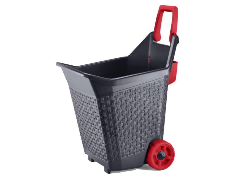 Je vybaven praktickým úložným prostorem na drobnosti, pevnými kolečky a polohovací rukojetí pro pohodlnou manipulaci. Díky nízké hmotnosti a ergonomickému provedení se vozík snadno ovládá i při plném zatížení. Vysoce odolný plast zajišťuje dlouhou životnost a odolnost vůči povětrnostním vlivům.