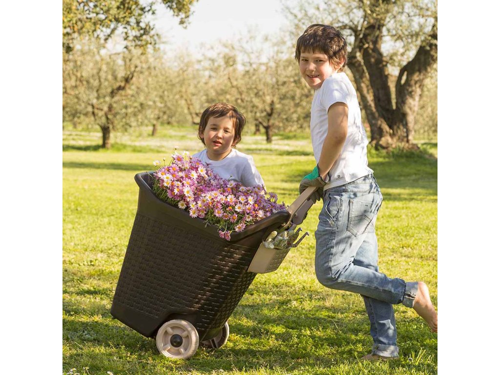 Je vybaven praktickým úložným prostorem na drobnosti, pevnými kolečky a polohovací rukojetí pro pohodlnou manipulaci. Díky nízké hmotnosti a ergonomickému provedení se vozík snadno ovládá i při plném zatížení. Vysoce odolný plast zajišťuje dlouhou životnost a odolnost vůči povětrnostním vlivům.