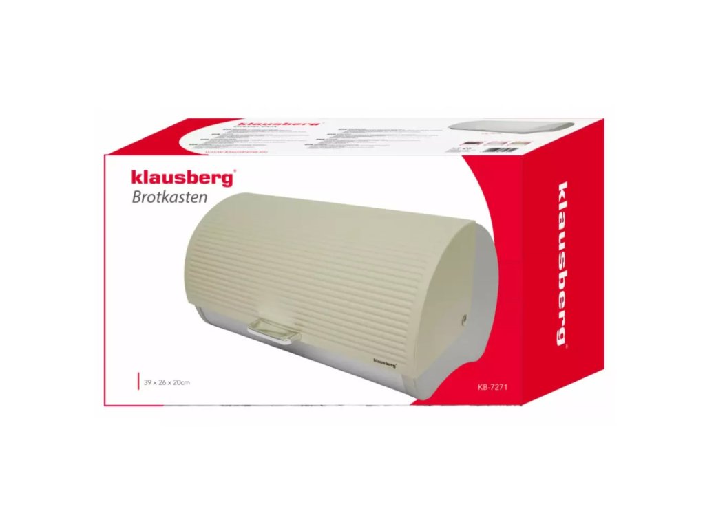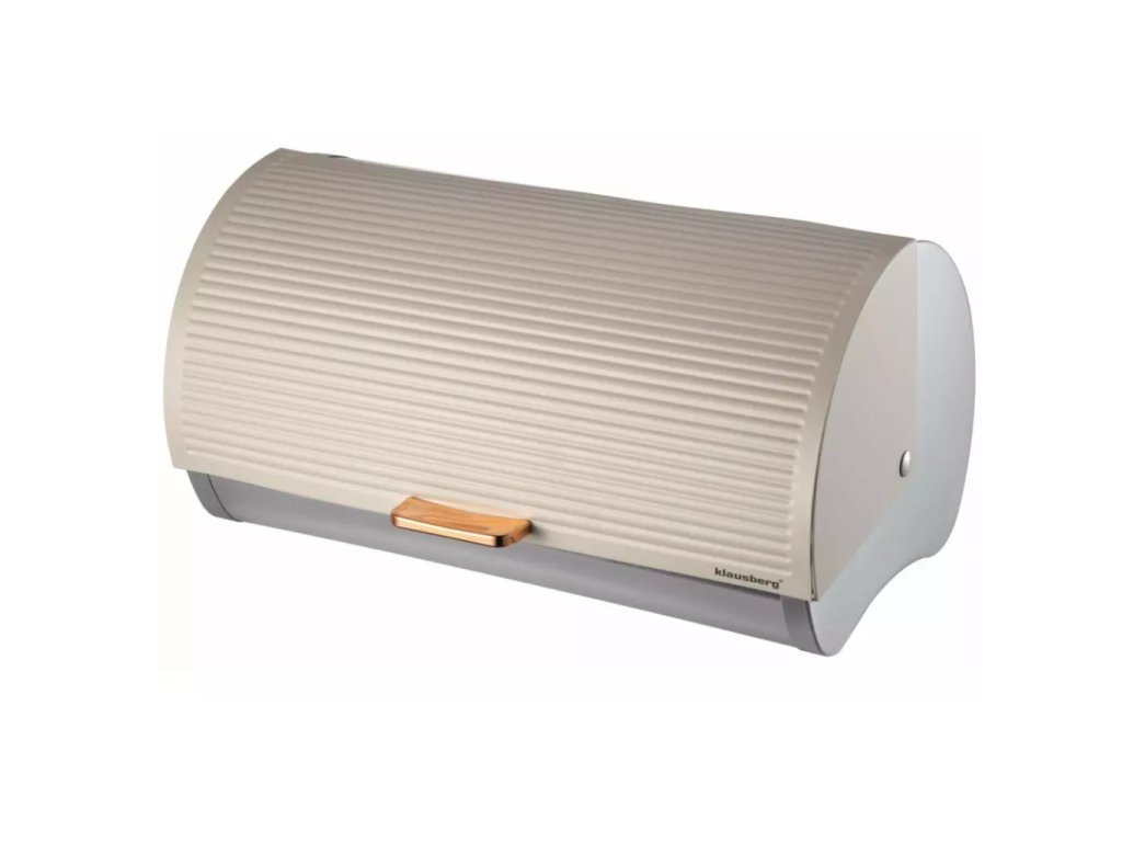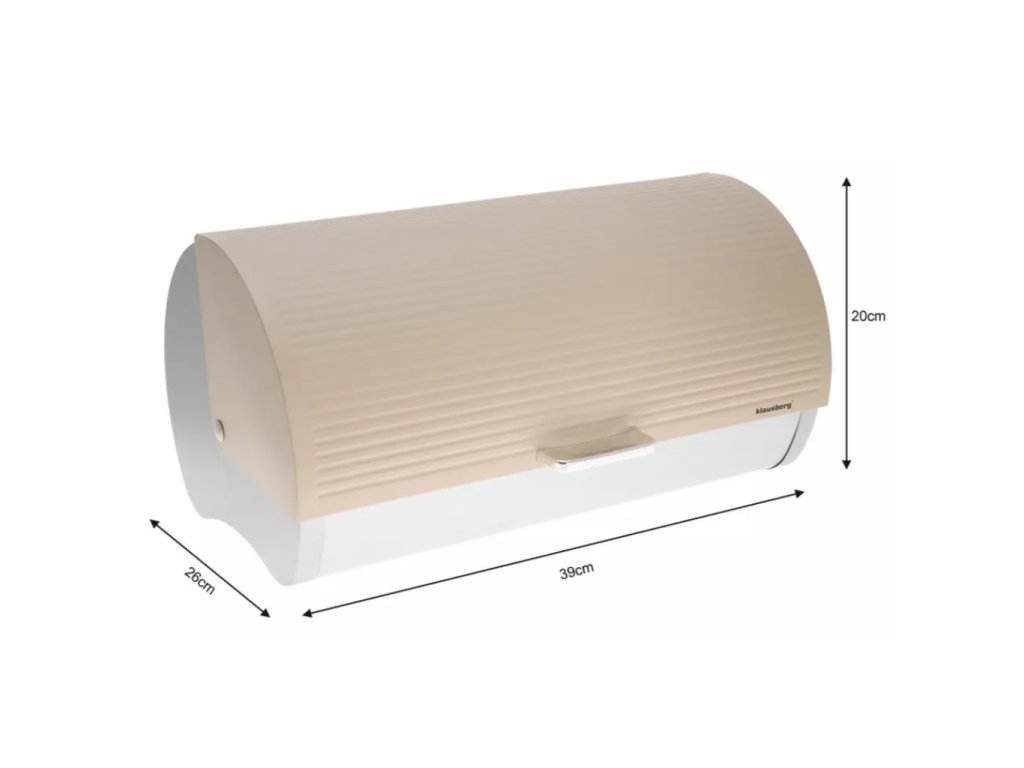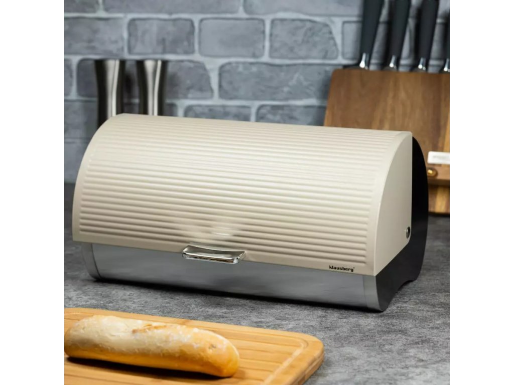 Chlebník z ušlechtilé oceli ve stříbrné barvě. Víko s béžovým smaltovaným povrchem. Můžete skladovat všechny druhy chleba: chléb, rohlíky, bagety a dokonce i muffiny. Zatahovací kryt se hladce otevírá a zavírá, při otevření nevyžaduje další prostor.
