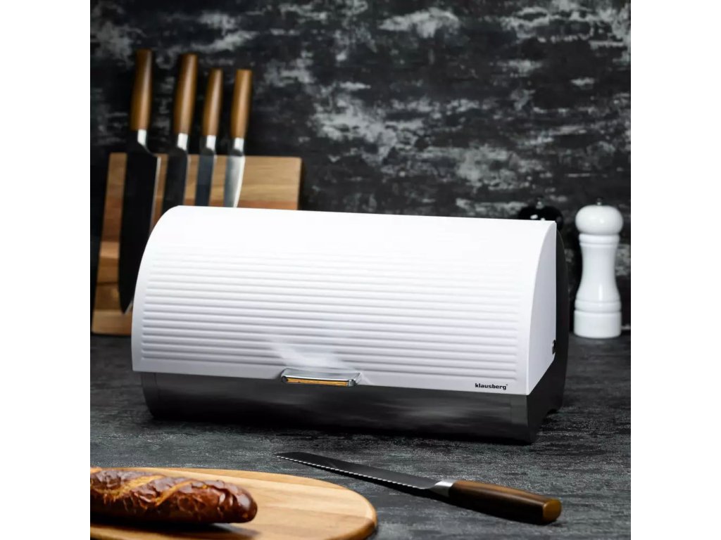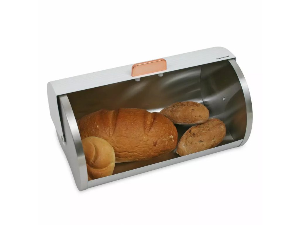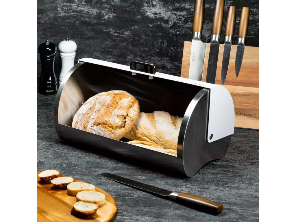 Chlebník z ušlechtilé oceli ve stříbrné barvě. Víko s bílým smaltovaným povrchem. Můžete skladovat všechny druhy chleba: chléb, rohlíky, bagety a dokonce i muffiny. Zatahovací kryt se hladce otevírá a zavírá.