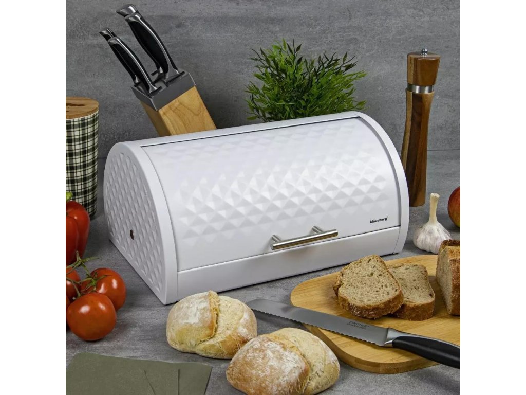 - Chlebník v moderním provedení je vyroben z odolného a pevného kovu.