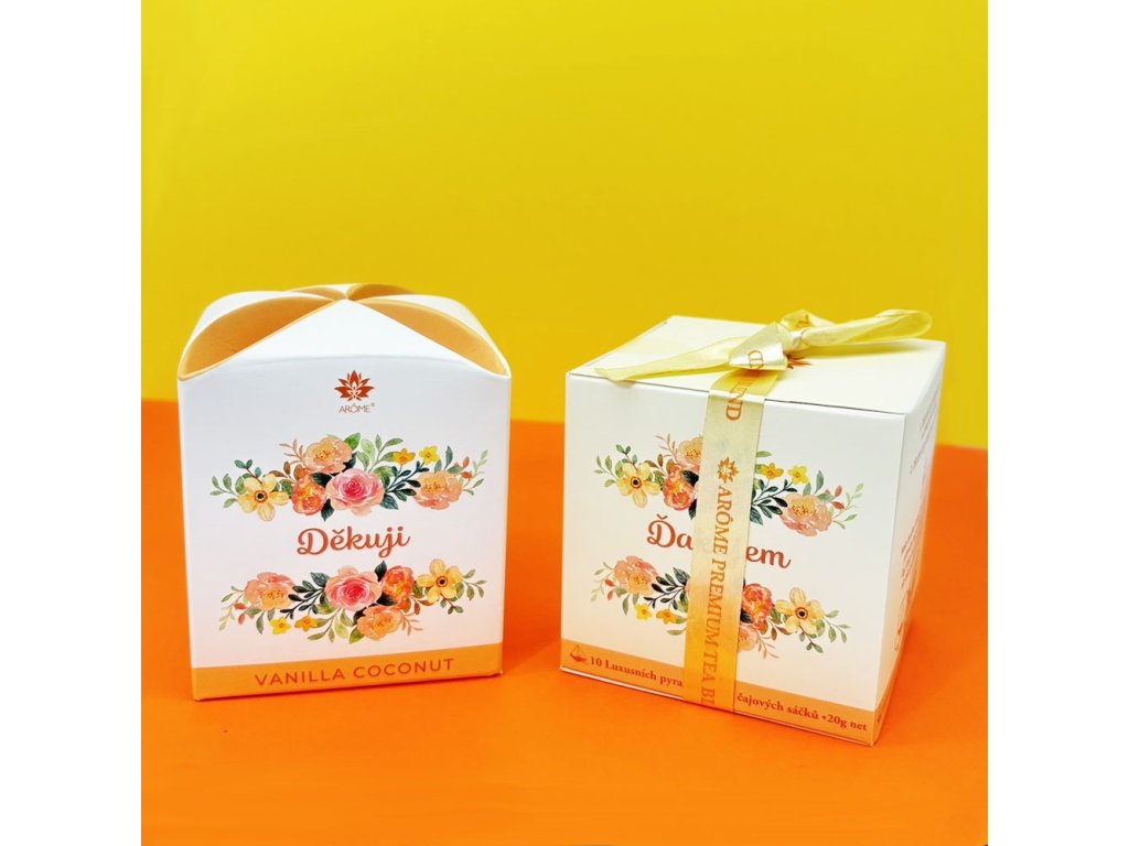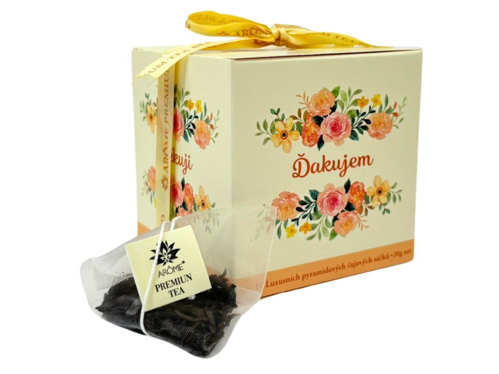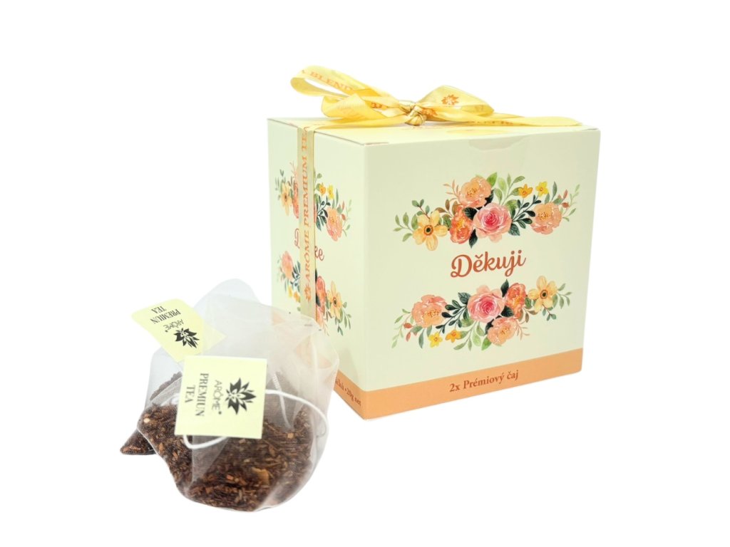 - Lahodný zelený čaj ze Sri Lanky. Dvě příchutě po 5 sáčcích - heřmánek a citronela, borůvka a bez. V barevné papírové krabičce s nápisem Děkuji.