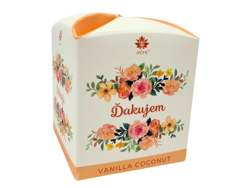 - Vonná svíčka ve skle, balená v krásné papírové krabičce ve tvaru květu s nápisem ,,Děkuji". Hmotnost 90 g, doba hoření 22 hod. Vůně vanilky a kokosu.