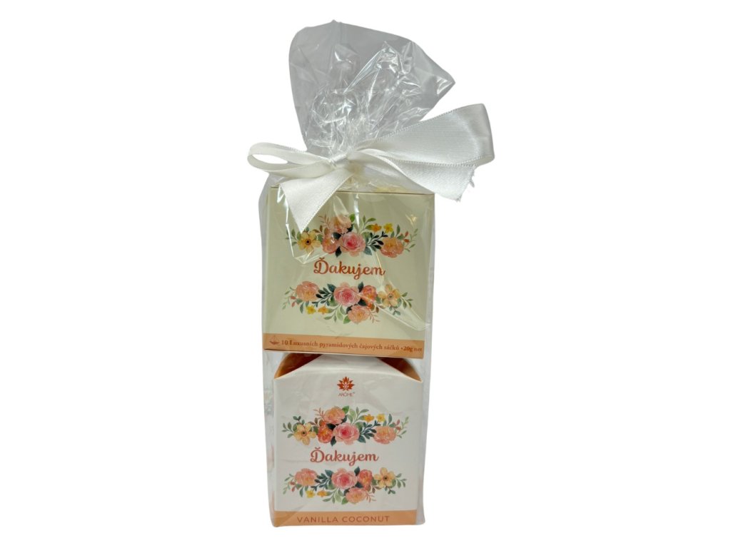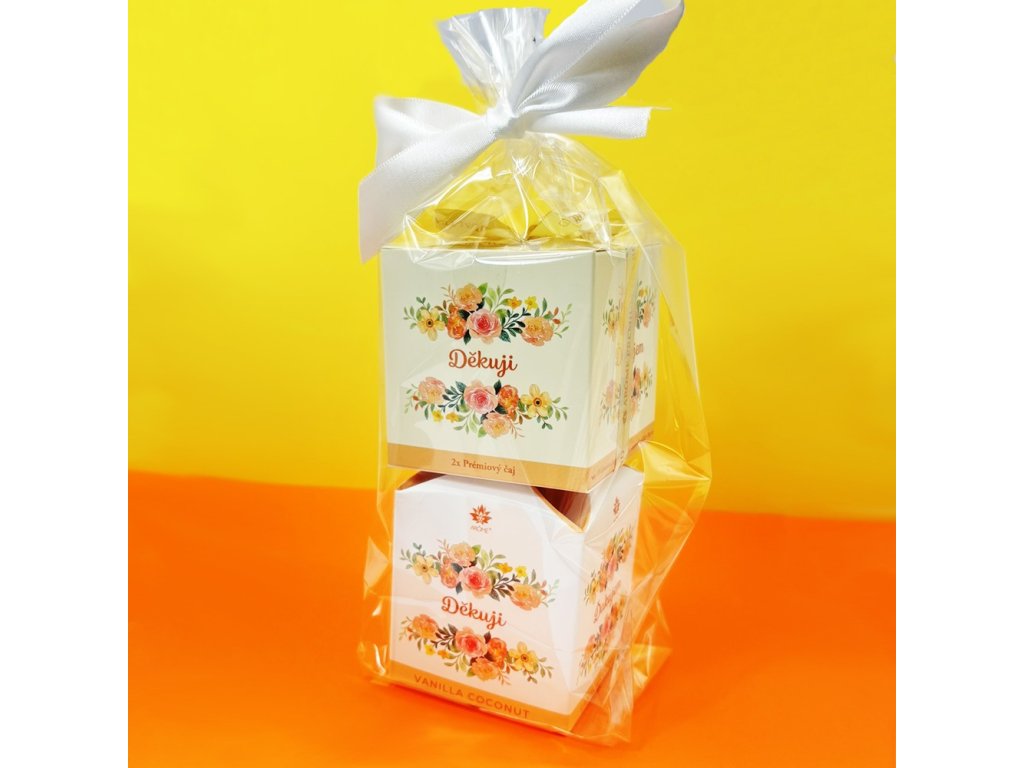 Dárková sada s nápisem Děkuji obsahuje vonnou, svíčku a lahodný set čajů. Dárkově balené.