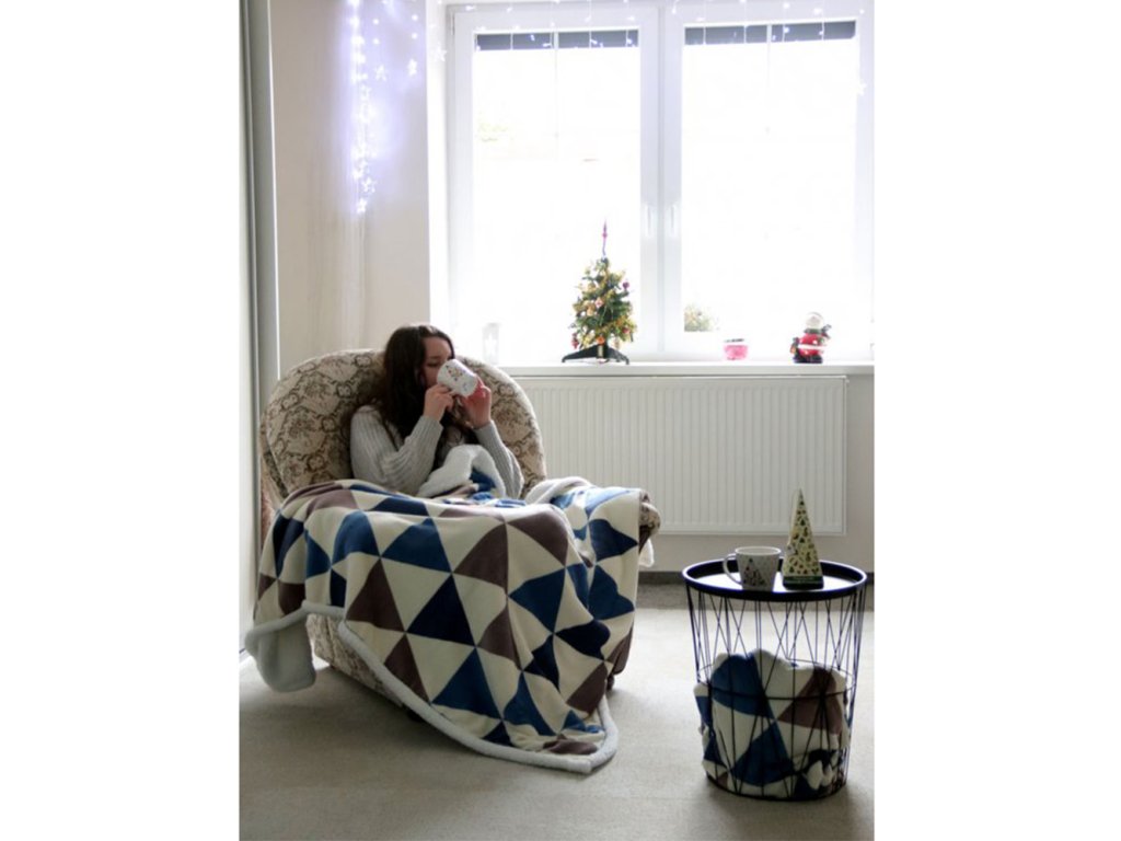Hřejivá, lehoučká mikroflanelová deka, kterou budete milovat při odpoledním odpočinku nebo večer při sledování televize. Moderní design modrých a bílých trojúhelníků dodá interiéru moderní vzhled. Skvěle poslouží i jako přehoz přes pohovku či postel.