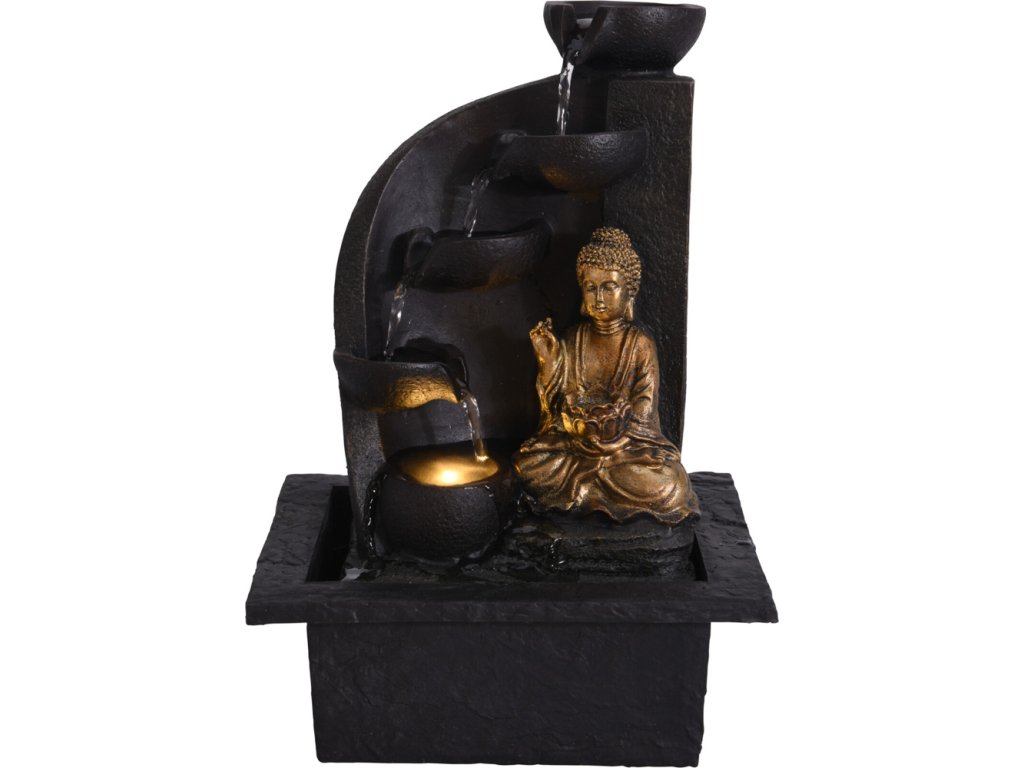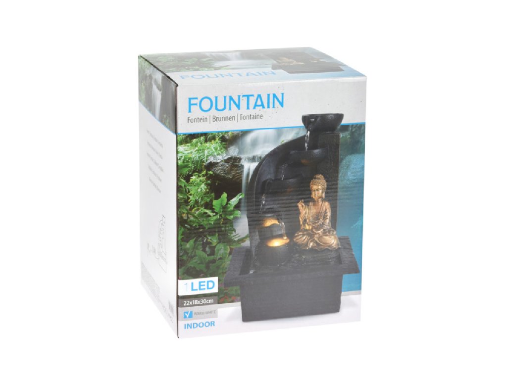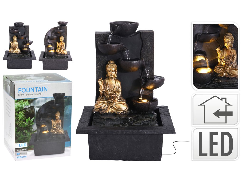 Fontána Buddhy s LED páskem o délce 1,5 m. Rozměr 21,5 x 18 x 30 cm. Vlevo
