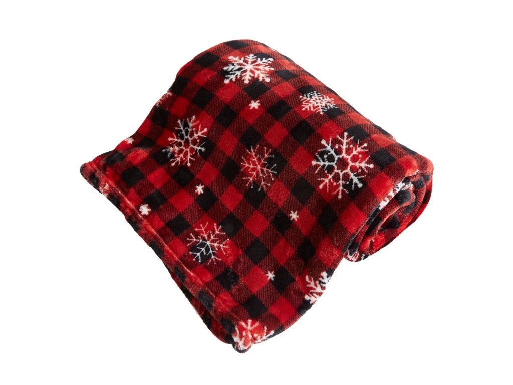 Deka je v červeném káru s bílými vločkami – ideální zimní a vánoční motiv.