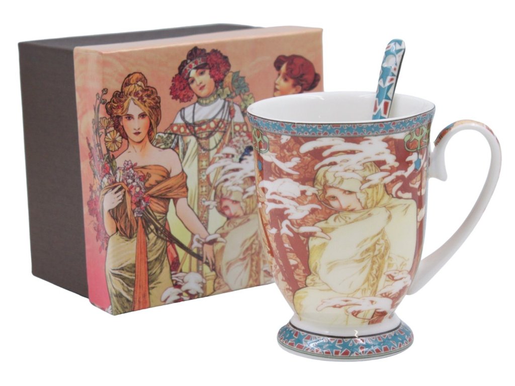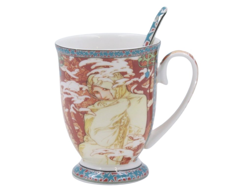 Větší porcelánový hrnek se lžičkou na čaj, svařák, vídeňskou kávu nebo horkou čokoládu. Vyniká krásnou dekorací mistrovského díla českého malíře Alfonse Muchy Zima.