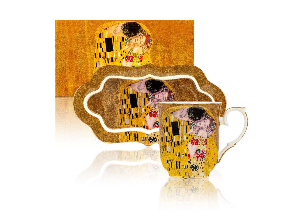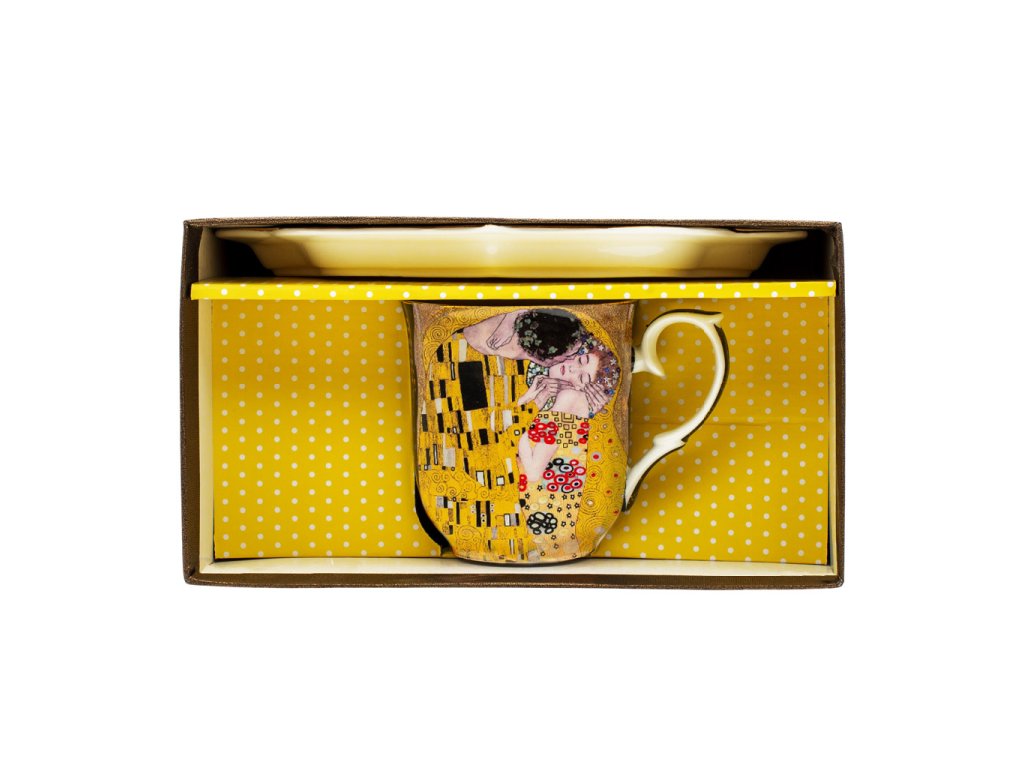 Porcelánový hrnek o objemu 360 ml s dekorem z díla Gustava Klimta, Polibek a k tomu větší podtácek ve stejném designu. Praktický podtácek velmi oceníte při servírování, využijete na pohoštění, zákusek, svačinu, nebo ovoce. Baleno v hezké dárkové krabičce, nebudete mít starosti s balením, pokud chcete věnovat jako dárek.