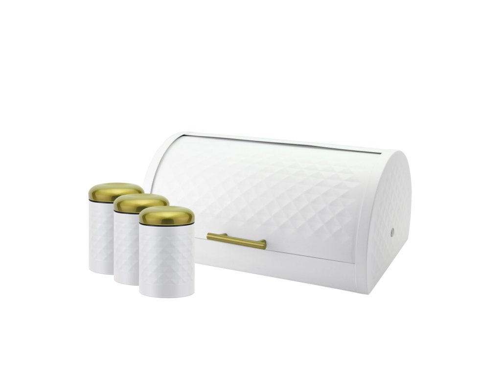 Nerezový chlebník může zdobit interiér každé kuchyně a zároveň dokonale zachová čerstvost pečiva. Rolovací víko se hladce otevírá a zavírá. Zlaté detaily na krabici jí dodávají moderní vzhled. Kromě chlebníku získáte tři dózy na potraviny ve stejném designu s víčky ve zlaté barvě. Lze je použít na kávu, cukr apod.