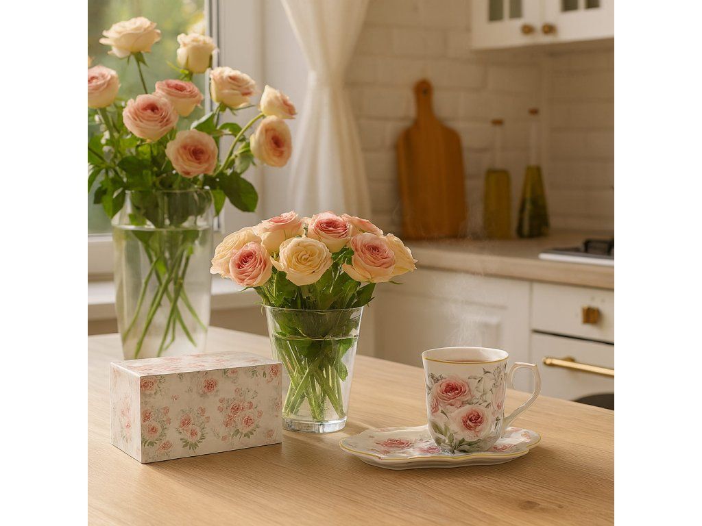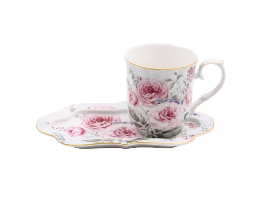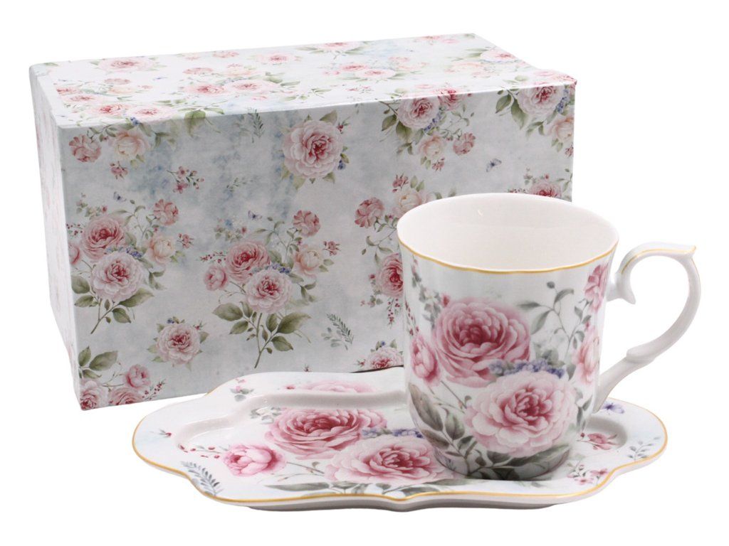 Porcelánový hrnek o objemu 360 ml jemně dekorovaný květy růže a k tomu větší podtácek ve stejném designu. Praktický podtácek velmi oceníte při servírování, využijete na pohoštění, zákusek, svačinu, nebo ovoce. Baleno v hezké dárkové krabičce, nebudete mít starosti s balením, pokud chcete věnovat jako dárek.