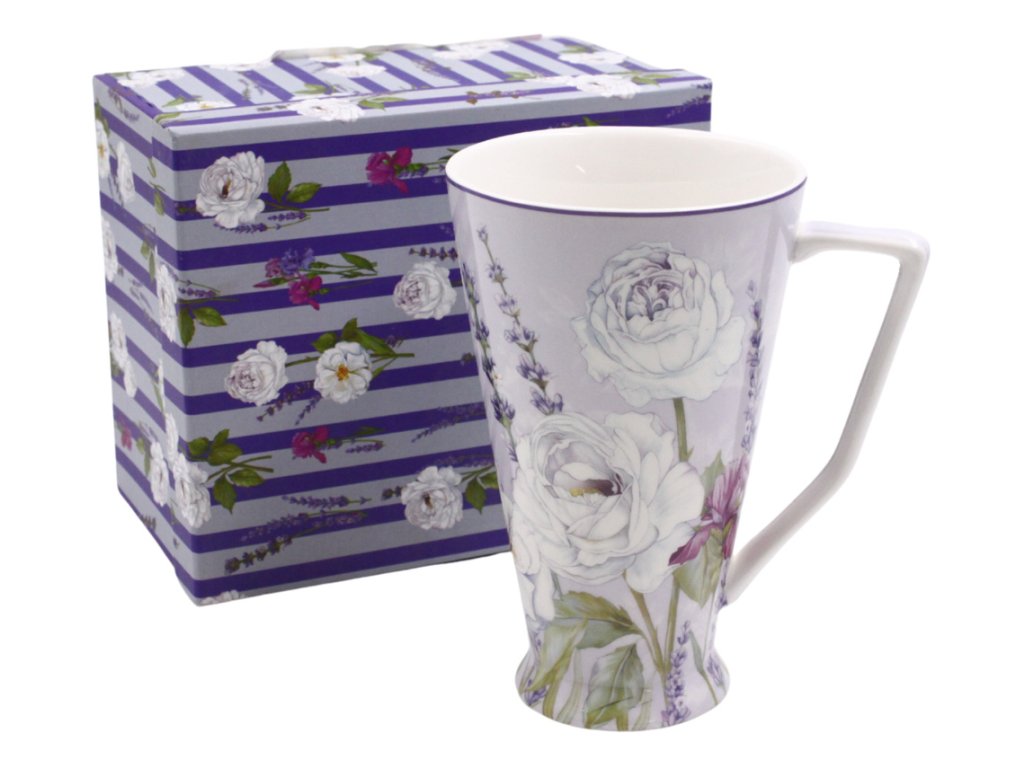 Jemný levandulový dekor na vysokém porcelánovém hrnku, který má originální tvar a je zabalen v krásném dárkovém balení. Hrnek se skvěle hodí na čaj, svařák, vídeňskou kávu nebo třeba horkou čokoládu.