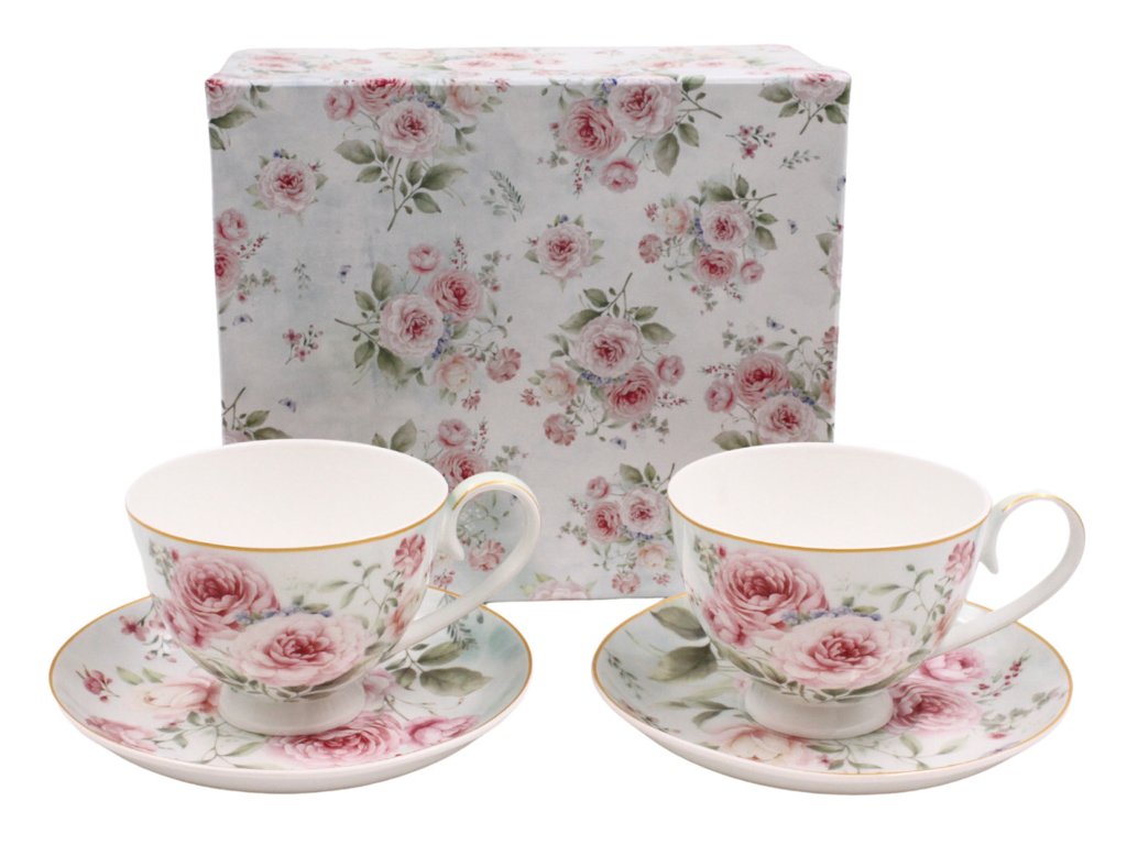 Sada dvou porcelánových šálků s podšálky na kávu nebo čaj. Jemný dekor s květy růže vypadá nádherně a luxusně. Baleno v dárkové krabičce.