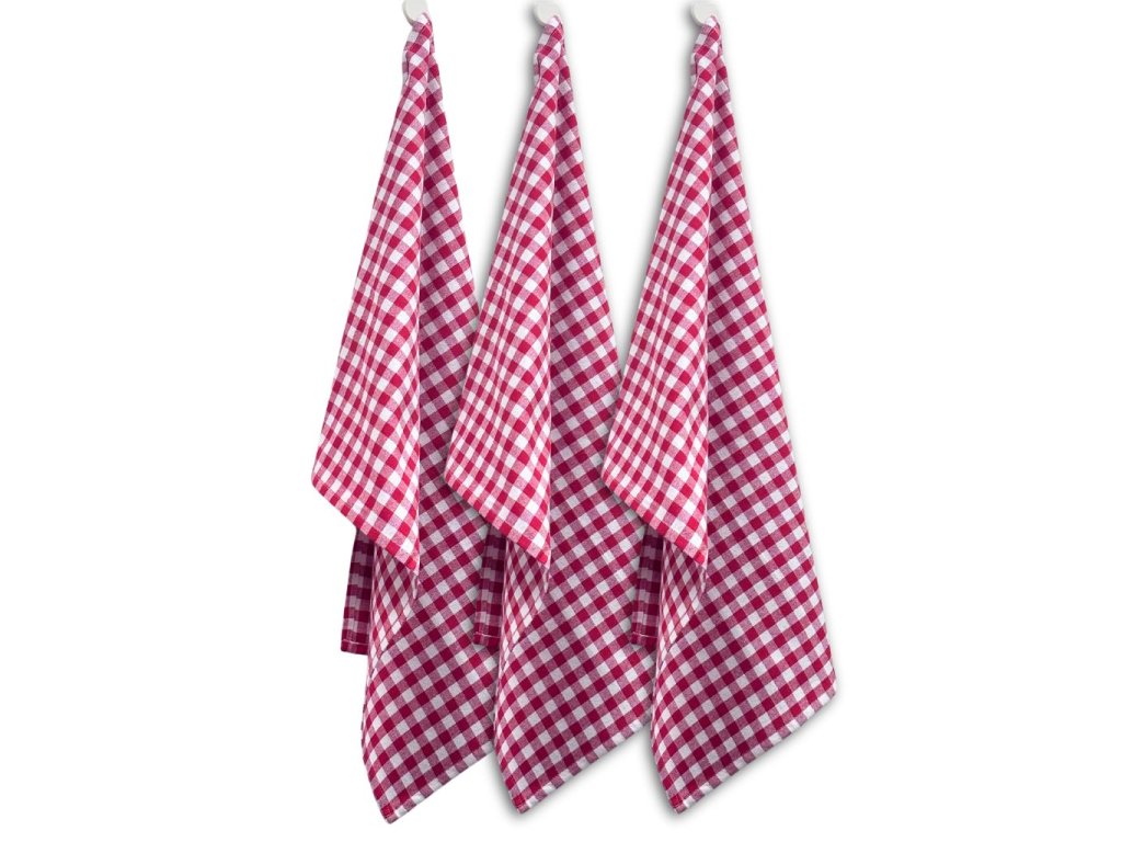 Sada 3 kusů bavlněných utěrek s károvaným vzorem v červené barvě. Utěrky doporučujeme před prvním použitím vyprat, lépe pak plní svou funkci savost.