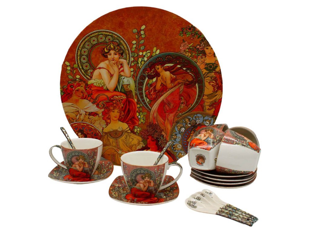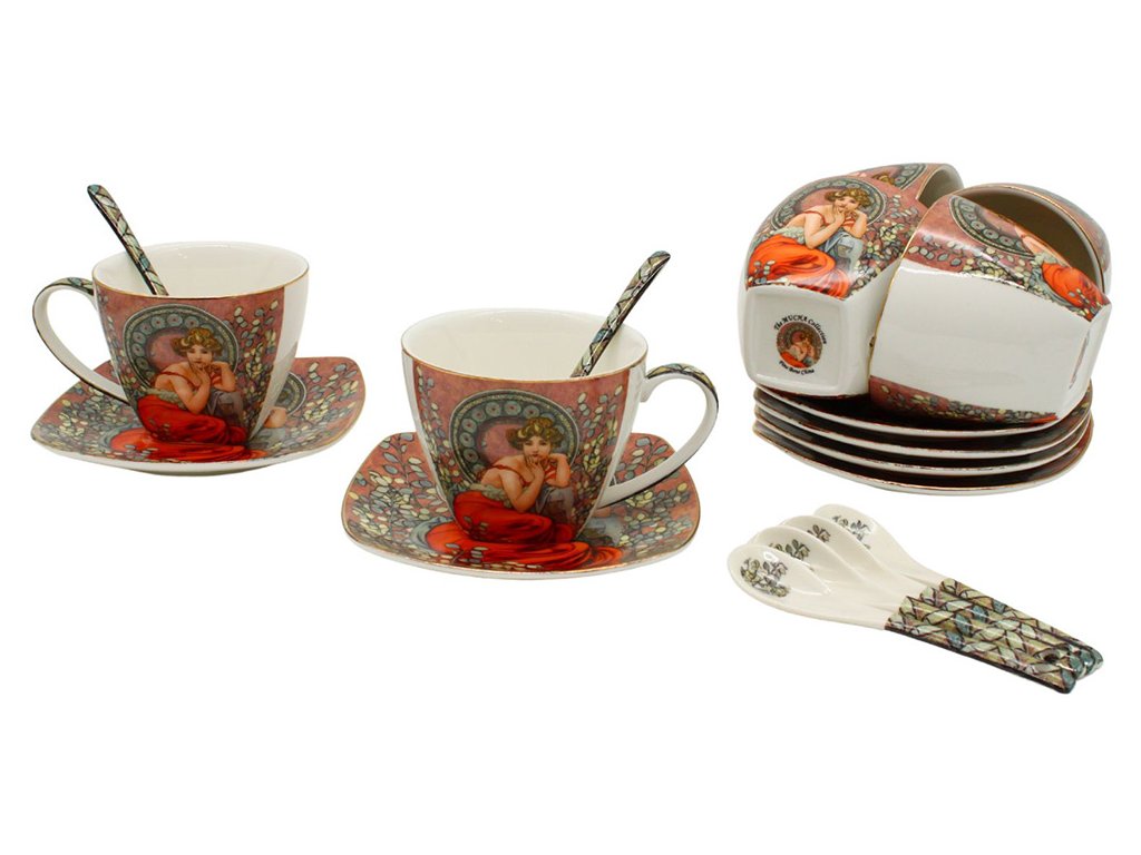 Elegantní vysoce kvalitní tenký porcelánový set s fascinujícím replikou díla slavného českého malíře Alfonse Muchy. Sada se skládá ze šesti porcelánových šálků, podšálků a lžiček a je zabalena v dárkové krabičce.