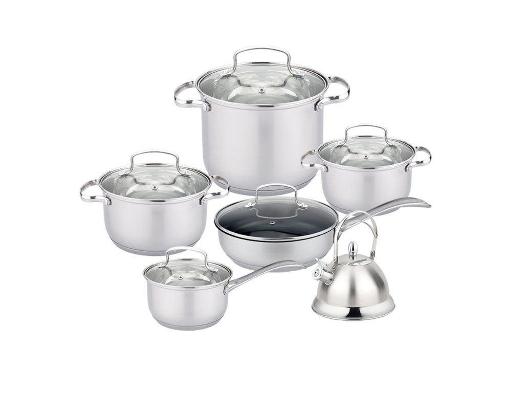 Sada nerezového nádobí - 12dílná. Povrch v kombinaci lesku a matu, sada je vhodná pro všechny druhy sporáků včetně indukce.
