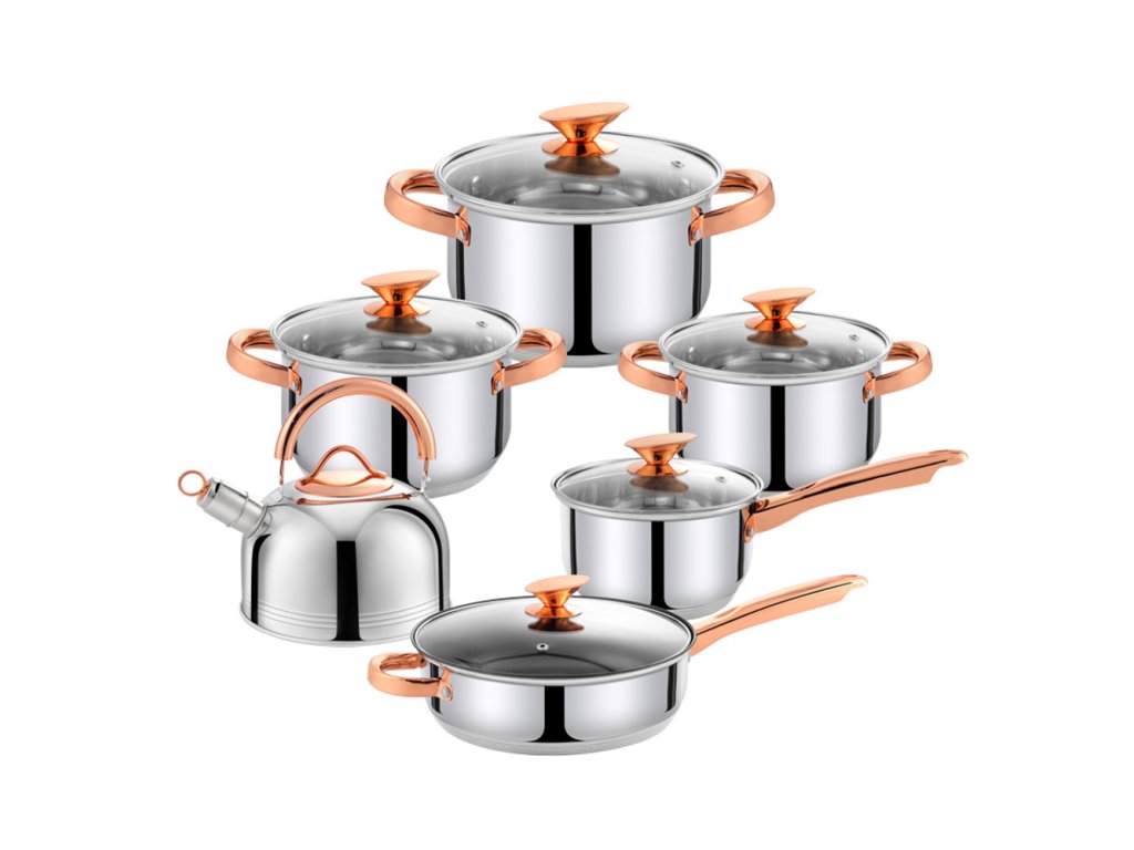 Sada nerezového nádobí, 12dílná, úchyty v barvě mědi