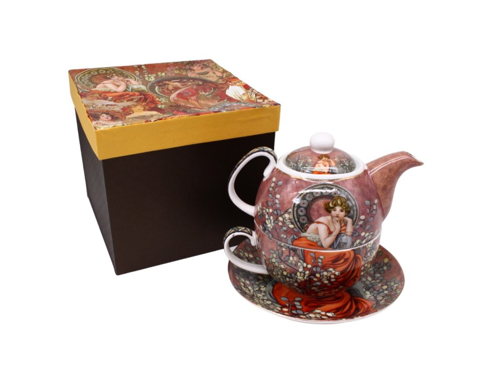 Exkluzivní porcelánová čajová souprava pro jednoho zvaná též Tea for one je jako stvořená pro chvíle odpočinku. I díky krásnému dekoru z díla Alfonse Muchy si čaj ze soupravy opravdu vychutnáte. Čajová souprava pro jednoho obsahuje konvičku, hrnek, podšálek a pokličku. Vše do sebe krásně pasuje, díky tomu je i manipulace s horkým nápojem o něco bezpečnější.