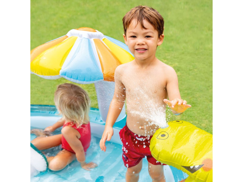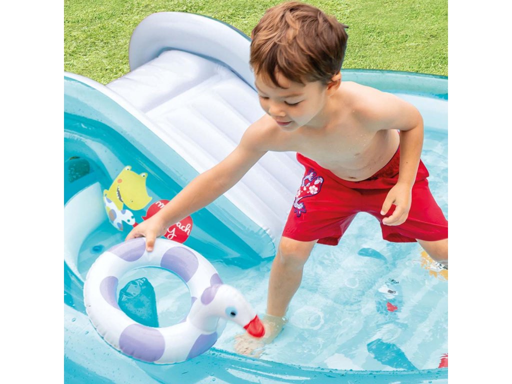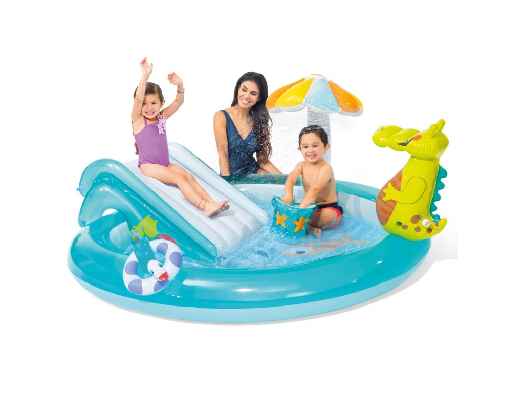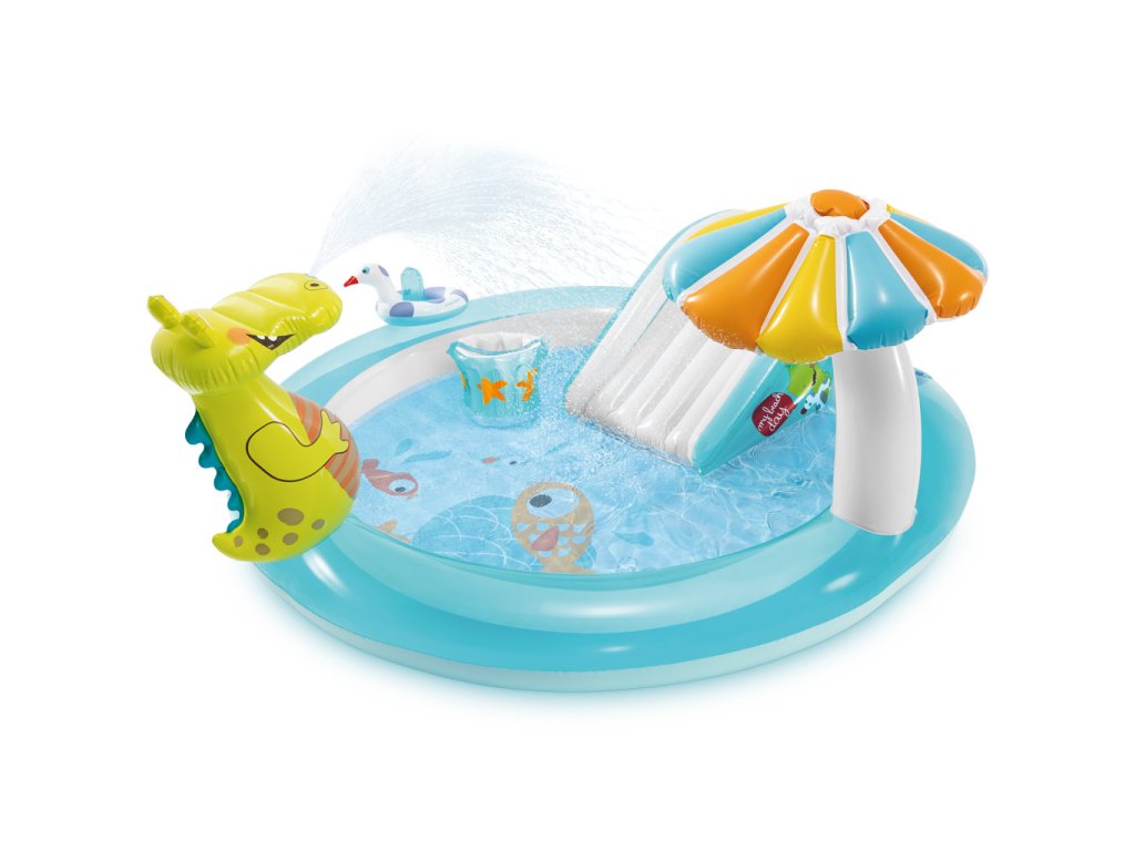 Hrací centrum INTEX s krokodýlem je zábavné bazénové hrací centrum se skluzavkou, vodní sprchou (připojení na zahradní hadici), dětským brouzdalištěm a dalšími doplňky.