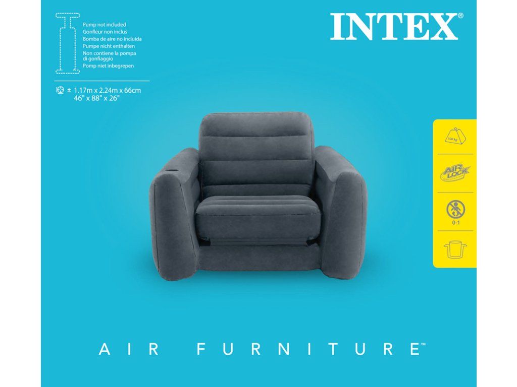 Křeslo stvořené pro relax. Můžete z něj sledovat televizi, číst knihu nebo zkrátka jen relaxovat. Nafukovací křeslo INTEX lze rozložit a spát na něm. Jedná se o jednolůžko o celkových rozměrech 224 x 117 x 66 cm. Univerzální výrobek, který má funkci křesla i lůžka. Díky této možnosti bude použití tohoto výrobku záviset na vašich potřebách. První možností je pohodlné křeslo s opěradlem a područkami, ale v případě potřeby dalšího spaní - stačí rozložit sedák.