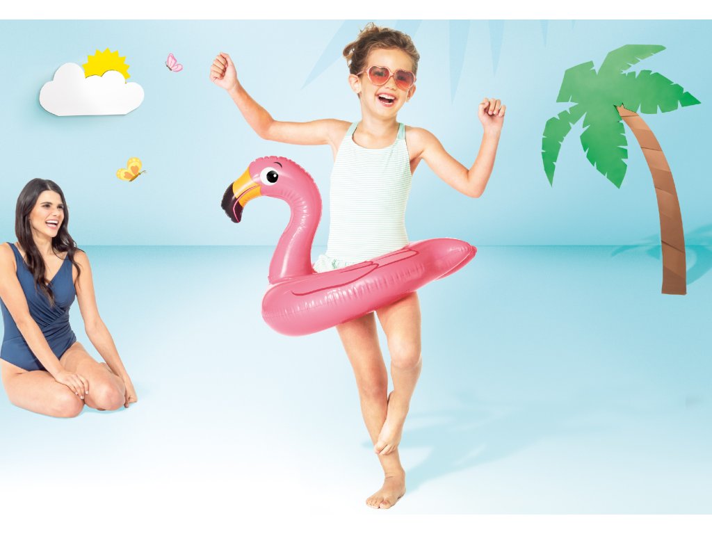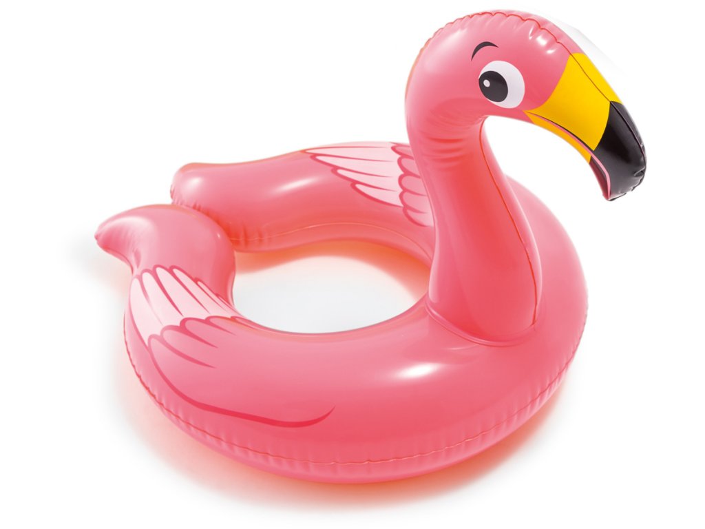 Růžový nafukovací kruh s hlavou plameňáka udělá dětem radost. Poskytne spoustu zábavy u bazénu nebo na pláži.
