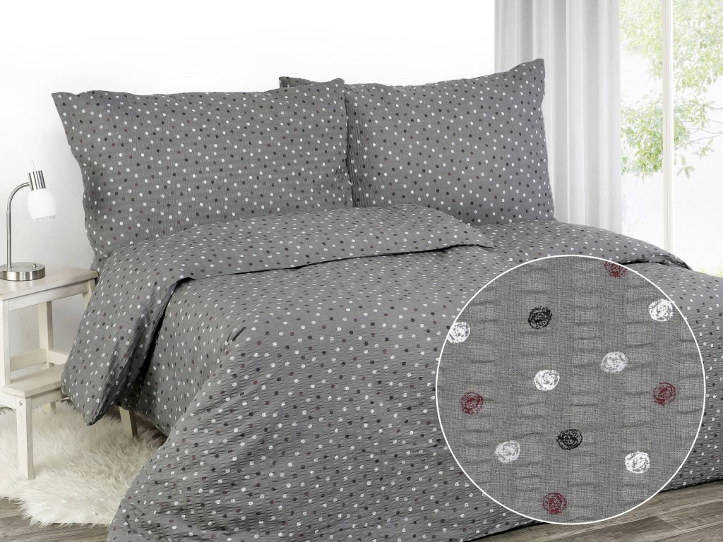 Vneste do své ložnice moderní a hravou atmosféru s krepovým povlečením v šedé barvě zdobeným jemným puntíkovým vzorem. Tento nadčasový design je ideální pro každého, kdo hledá spojení stylu a praktičnosti. Krepový materiál je příjemný na dotek, lehký a nenáročný na údržbu, což zajišťuje pohodlí a snadné používání.
