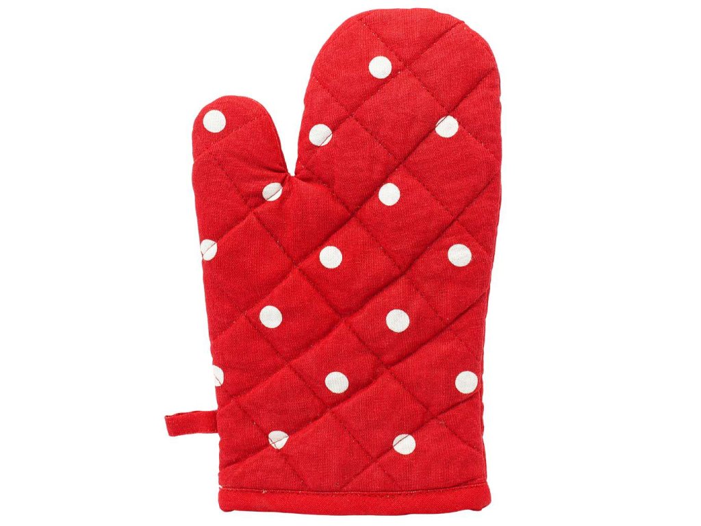 Praktická červená prošívaná kuchyňská chňapka s veselým puntíkovým vzorem se stane nepostradatelným pomocníkem při vaření, pečení i grilování. Je vybavena magnetem a poutkem pro snadné zavěšení, takže ji budete mít vždy po ruce.