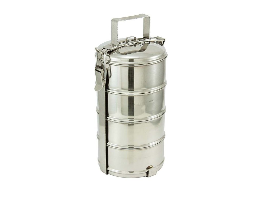 Čtyřdílný jídlonosič z nerezové oceli je určen pro pohodlné přenášení potravin.