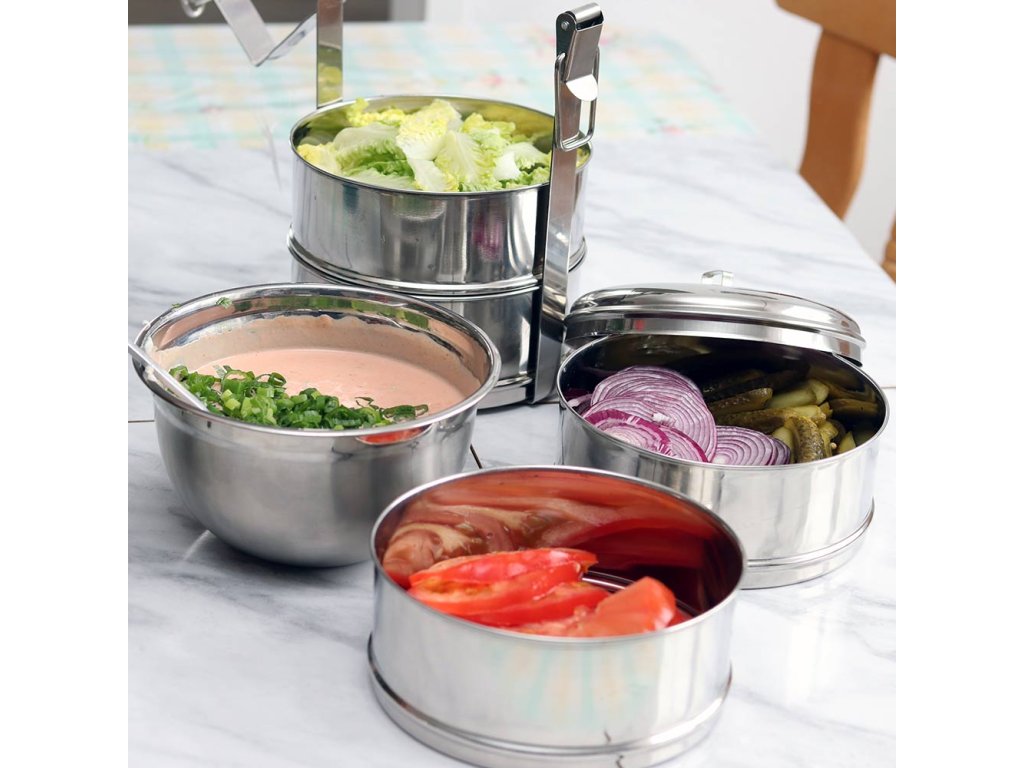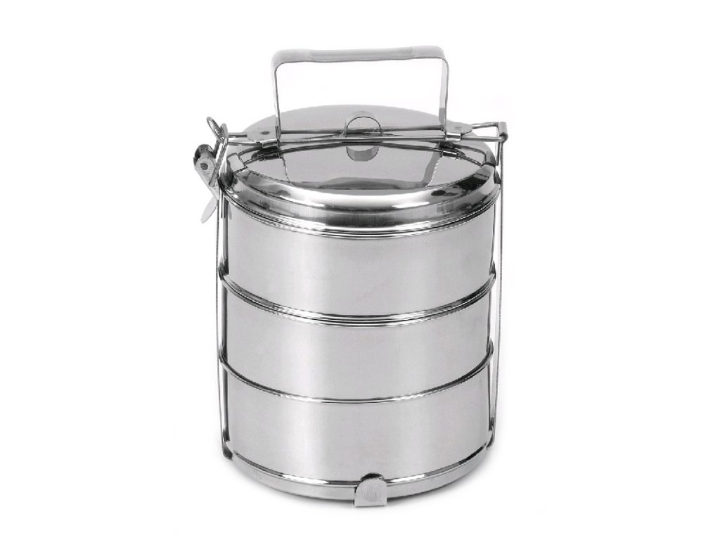 Třídílný jídlonosič z nerezové oceli je určen pro pohodlné přenášení potravin.