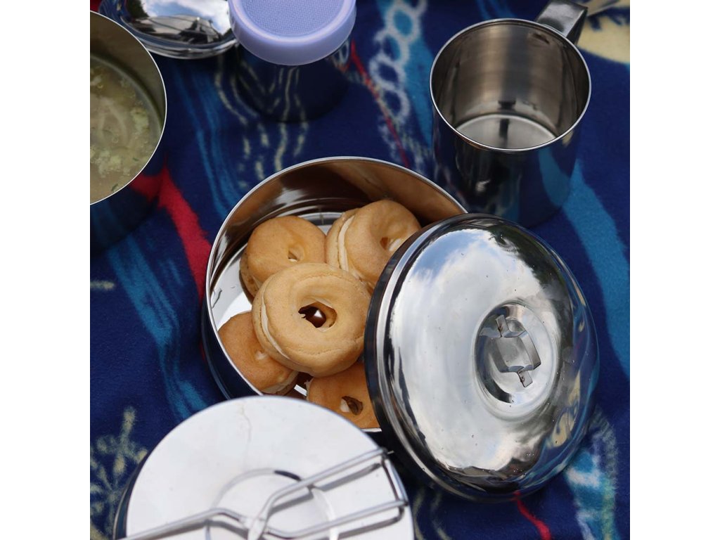 Třídílný jídlonosič z nerezové oceli je určen pro pohodlné přenášení potravin. Jídlonosič je vybaven přezkou, která zajištuje pevné uzavření. Sada se skládá z vrchní poklice a třech nerezových misek o objemu 1000 ml. Celkové rozměry jsou 16 x 27 cm.