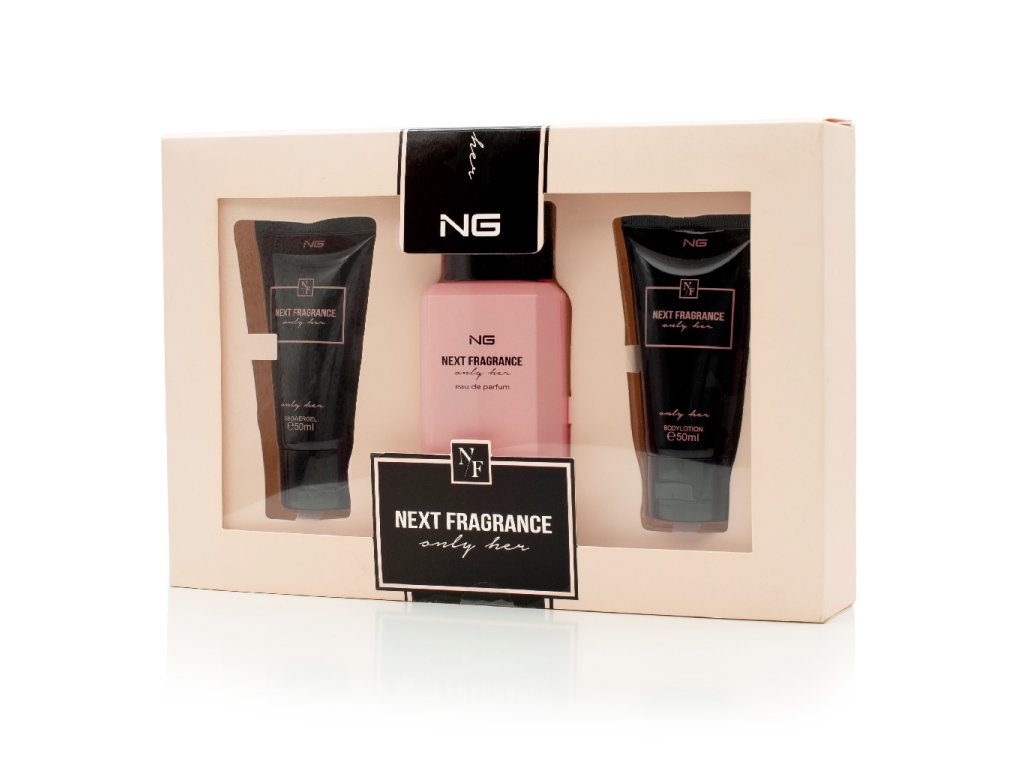 Dárková sada pro ženy obsahuje parfémovanou vodu 100 ml, tělové mléko a sprchový gel 50 ml s vůní Next Frangrance NG.