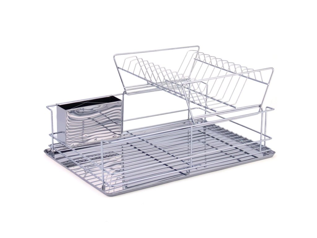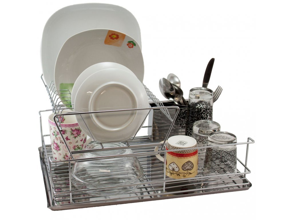 Odkapávač je vyroben z pochromované oceli, opatřen nerezovým podnosem a nerezovým zásobníkem na příbory.