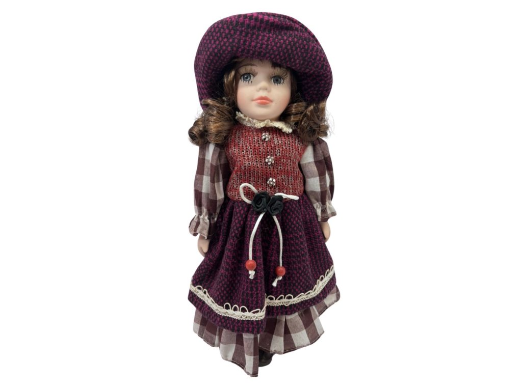 - Porcelánová panenka - tmavovláska s kloboučkem v kostkovaných šatech