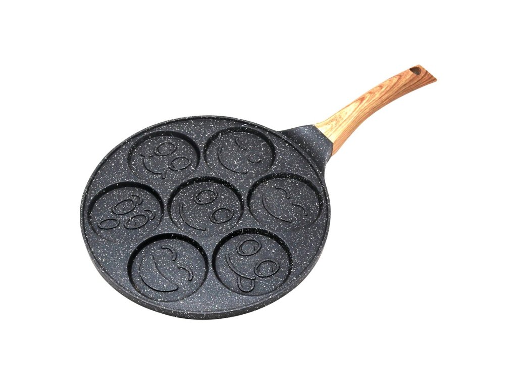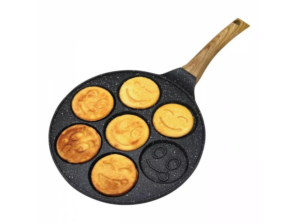Pánev/Lívanečník na 7 lívanců ve tvaru smajlíků. Nepřilnavý mramorovaný povrch, průměr pánve 26,5 cm.