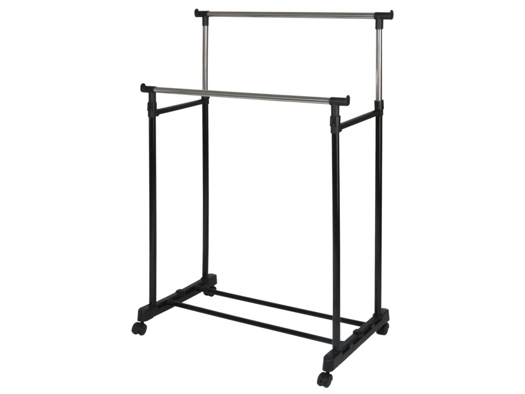Praktický dvojitý stojan na šaty s výškově nastavitelnými rameny a s odkladačem na boty nebo krabice.