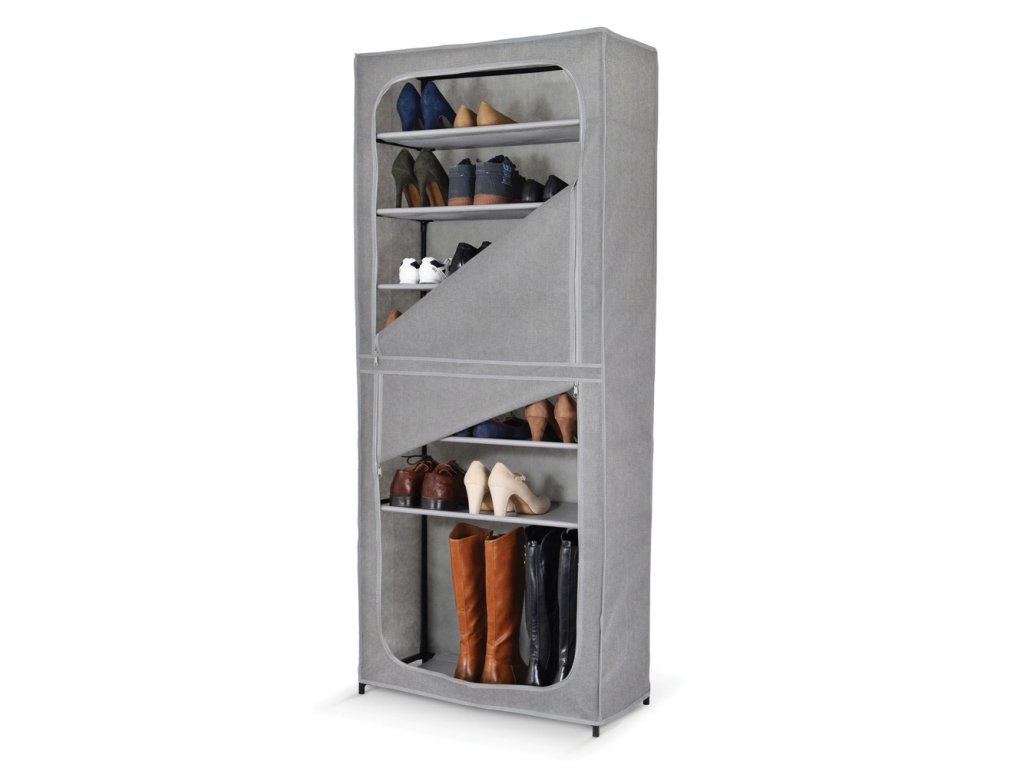 Textilní dvojitá uzavíratelná skříň se 7 policemi pro přehledné skladování věcí, ideálně doporučujeme boty. Rozdělená na dvě části pojme mnoho páru bot a vyřeší tak problém s uložením obuvi pro celou rodinu.