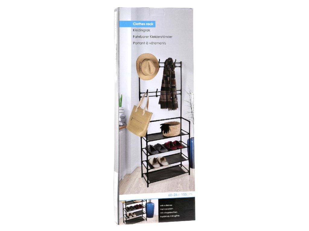 Stojan na oblečení se 4 policemi a věšáky.