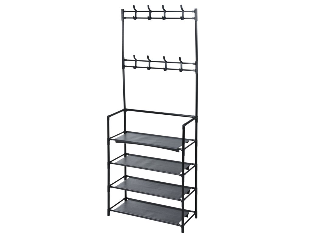 Multifunkční věšák je skvělým doplňkem do jakékoli místnosti ve vašem domě, od podkroví až po sklep. Kovový věšák je vybaven čtyřmi policemi pro uložení menších předmětů, jako jsou boty nebo tašky, a osmi háčky pro zavěšení věcí. Police jsou vyrobeny z netkaného polyesteru, který se snadno udržuje v čistotě.